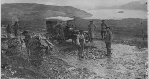 Сликано на крајната јужна точка од Малото Преспанско Езеро, во близина на селото Трен за време на маршот на Французите од Горица (Корча) до Лерин. Јануари 1917 Генералот Сал со своите соработници. Сликано на 2 Февруари 1917 во близина на селото Шулин за време на маршот на Французите од Драч до Битола. Слика од рушената црква во село Герман, сликана ...