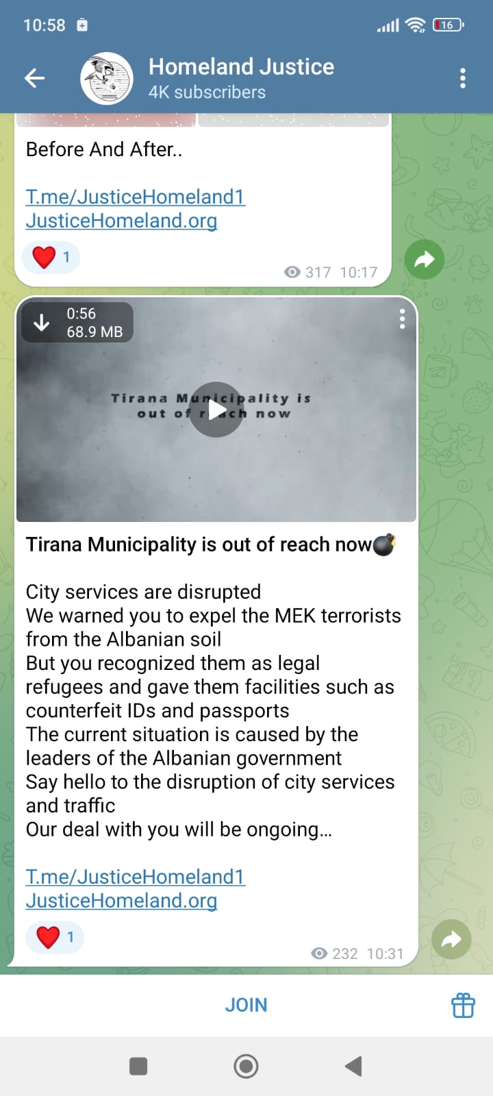 Објавата е придружена со слики од официјалната веб-страница на Општина Тирана пред и по сајбер нападот, додека во друга порака велат дека ја предупредиле Албанија да ги „протера терористите на МЕК“.