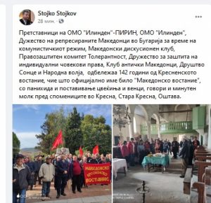 „Претставници на ОМО “Илинден”-Пирин, ОМО “Илинден”, Дружество на репресираните Македонци во Бугарија за време на комунистичкиот режим, Македонски дискусионен клуб, Правозаштитен комитет Толерантност, Дружество за заштита на индивидуални човекови права, Клуб антички Македонци, Друштво Сонце и Народна волја, одбележаа 142 години од Кресненското востание, чие што официјално име било “Македонско востание”, со панихида и поставивање цвеќиња и венци, говори и минутен молк пред спомениците во Кресна, Стара Кресна, Оштава”, напиша на својот фејсбик профил Стојко Стојков од ОМО “Илинден”-Пирин.