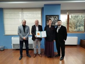 Претседателот на македонското друштво “Илинден“-Тирана, Никола Ѓурѓај, му ја врачи Благодарницата “Илинден“ на институцијата Народен правобранител на Република Албанија.