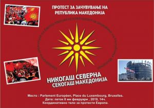 Во организација на Координативното тело за протести на Македонците во Европа, на 8 февруари 2019 година, петок, со почеток во 14 часот, ќе се одржи Семакедонски протест пред Европскиот парламент во Брисел. Понесени од универзалните вредности за човекови права, достоинство и почитување на волјата на Македонскиот народ на самоопределување и самоидентификација, потврдени на референдумот од 8 септември 1991 година и референдумот од 30 септември 2018 година, Македонците во Европа организираат голем Семакедонски протест пред седиштето на Европскиот Парламент во Брисел!